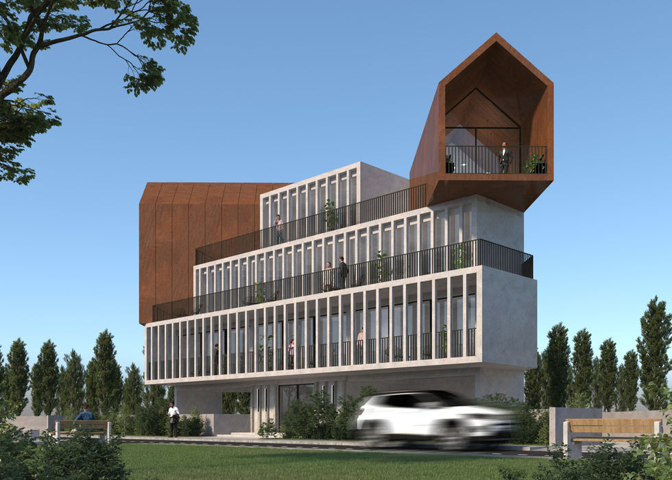 The façade is articulated through textured concrete frames and sculptural volumes clad in Corten steel. The warm, weathered steel contrasts with the lighter concrete structure, emphasizing the building’s massing and clearly expressing the hierarchy between its different uses.